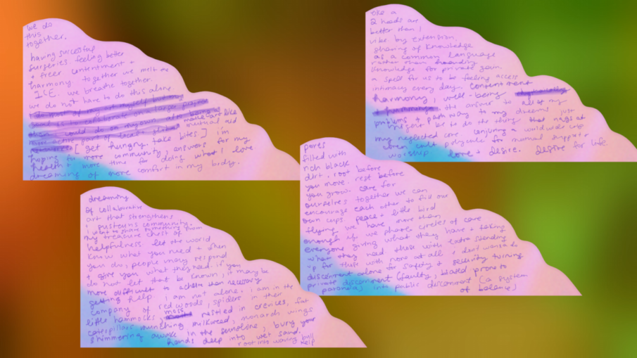 doing whichever “this” verb you wanna throw in. it can be whatever feels good for you. for me, it’s this dreaming moment and this space for just being in a collective community care moment. just being here and doing something in a way where the whole point is that we’re all experiencing it together. so as far as like what that might mean in terms of a collective dream moment, what are things maybe that you’ve been feeling like you’ve had to do alone that maybe there’s a sort of thinking about who else is also doing that? is it alone? or am i counting sort of the tree outside (that i love to look at) is doing it with me, we’re sort of in tandem at the moment. is it alone? are there other happenings that are happening that is a togetherness in one way, shape, or form or another? just a bit of, i guess, a bit of a reframing towards all of the ways that the interconnections are happening even when we’re not completely conscious of them. and sort of calling for the maybe like bird’s eye view of what that interconnectivity is and then more consciously being able to access that togetherness and then actively, hopefully, potentially, weave and thread through more very sort of like physical interconnectedness. and physical in terms of any way that you know – digital physicality or physical physicality or any type of – whatever that means to you, whatever form that takes for you.